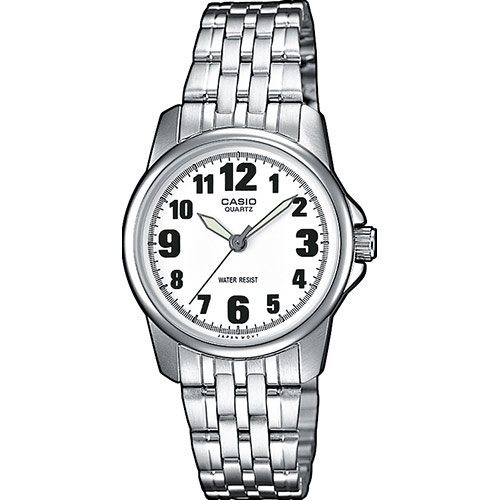 Orologio analogico Casio Collection. Bracciale in acciaio. Quadrante bianco, con indici e numeri. Peso 52 gr. 1 batteria per 3 anniLa batteria alimenta l'orologio per ca. 3 anni Bracciale in acciaio inoxResistente ed elegante: il bracciale in acciaio inox è un classico per gli orologi Cassain ottone ChiusuraDeployante Classificazione di impermeabilità (WR) a norma ISO 22810Questo modello è impermeabile a norma DIN 8310 e/o ISO 22810, sopporta quindi spruzzi leggeri. Evitare un contatto con una quantità maggiore di acqua Dimensione cassaca. 32,50mm x 28,05mm x 7,40mm (A x L x P) NeobriteLe lancette e/o le cifre hanno un rivestimento fluorescenti e si illuminano al buio dopo lo spegnimento di una fonte luminosa Pesoca. 52 g Tipo di pilaSR626SW Vetro mineraleIl vetro minerale, robusto e antigraffio, protegge l'orologio da danni antiestetici