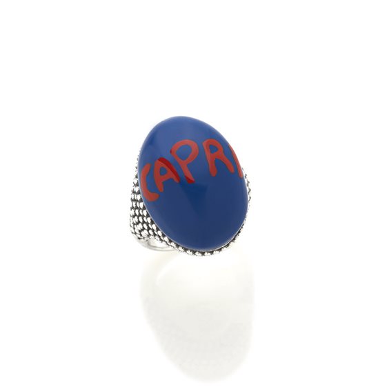 ANELLO IN ARGENTO CON SMALTO BLU E SCRITTA CAPRI IN ROSSO DI CHANTECLER.