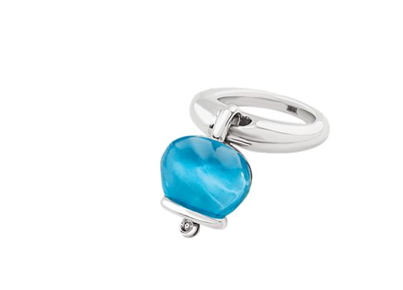 Anello Et Voilà Campanella medio in argento, resina sfaccettata a mano color topazio azzurro e un diamante. Composizione: Argento GR 14,50 Diamante CT 0,01 NR 1 Resina GR 0,90 NR 1