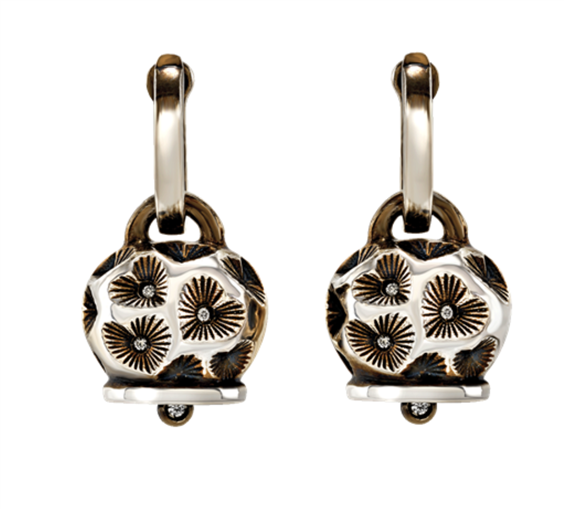Orecchini Et Voilà Campanella medi con cuori incisi a mano in argento invecchiato e diamanti taglio brillante