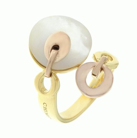 ANELLO CHIMENTO DELLA COLLEZIONE 'ECLISSE' IN ORO GIALLO E ROSA 18 Ct A FORMA DI CONTRARIE' CON MADREPERLA NATURALE TAGLIATA SU MISURA . IN OMAGGIO GARANZIA CONTRO IL FURTO ONLINE PER 12 MESI.