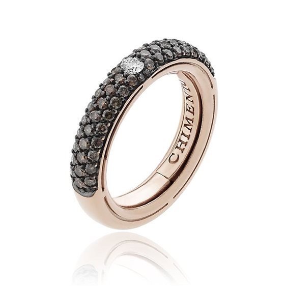 Anello in oro rosa con pavé di diamanti brown ct. 0,77. Stack Me FOREVER Stack è il nome degli anelli multimisura CHIMENTO pensati per essere indossati insieme in creative e originali sovrapposizioni. Sempre perfetti sulle dita, grazie all’esclusivo brevetto Size-Fit™, gli anelli sono disponibili in numerosi modelli con diverse altezze di fascia, diamanti e gemme colorate, e fino a cinque colorazioni di oro 18 k, satinato o lucido.