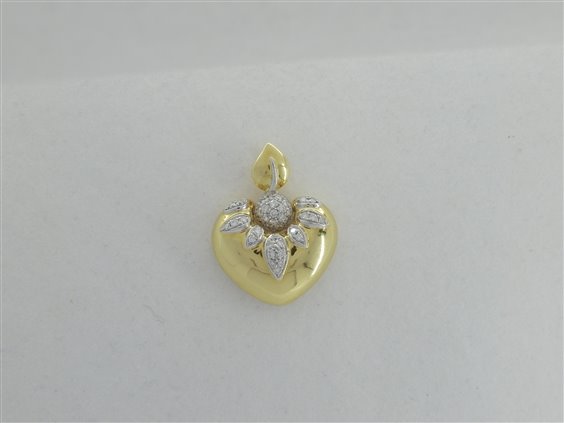 Pende in oro 750/1000 bicolore (bianco e giallo) a forma di cuore. Sono incassati diamanti a pavè su oro bianco per un totale di kt. 0,67 peso gr. 11,3. Il cerchio centrale è attaccato alla contromagllia a forma di foglia con riporto centrale in oro bianco ed è snodato.