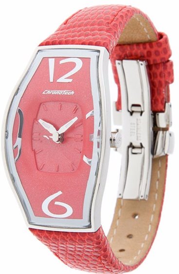 Orologio con vetro minerale a prisma allungato, fondello con 4 viti e corona a pressione. Cinturini in pelle rossa con chiusura deployante.