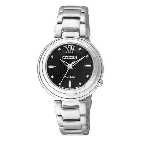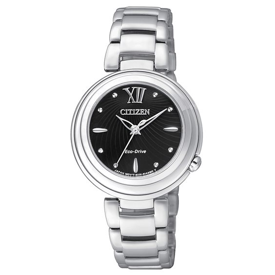 Orologio donna solo tempo modello Citizen L. Cassa in acciaio lucido diametro 30 mm spessore 7 mm. con corona posizionata a ore 4. Movimento Eco-Drive a carica luce infinita con riserva di carica di 6 mesi con avvertimento di carica insufficiente. Quadrante nero con lavorazione a ventaglio , indici applicati diamantati e lancette lucide. Vetro zaffiro. Impermeabile 5 bar (5 atm) Bracciale regolabile in acciaio lucido con chiusura deployante con pulsanti a scomparsa. Scatola Libretto Istruzioni e Garanzia 2 Anni Originali.