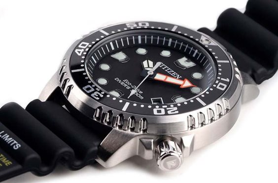 DIVER`S PROFESSIONALE CERTIFICATO ISO 6425 Orologio da donna Eco Drive (a carica luce infinita), con riserva di carica di 180 giorni Realizzato in cassa in acciaio, cinturino in morbido poliuretano. Vetro minerale. Ghiera girevole unidirezionale. Indici e sfere ad alta luminosità. Fondo e corona serrati a vite. WR 20 bar. Prodotto nuovo e originale, munito di manuale di istruzioni e GARANZIA INTERNAZIONALE Citizen di 24 mesi.