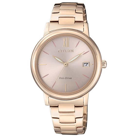Orologi solo tempo. Cassa in acciaio con trattamento PVD oro rosa lucido e spazzolato. Ansa 16 mm. Movimento al quarzo Eco-Drive a carica luce con riserva di carica a 180 giorni. Vetro minerale. Quadrante colore oro rosa, lancette luminose. Bracciale regolabile in acciaio con trattamento in PVD oro rosa lucido e spazzolato, chiusura dèployante con pulsanti. Impermeabile 5 atm.