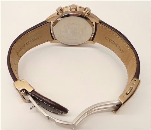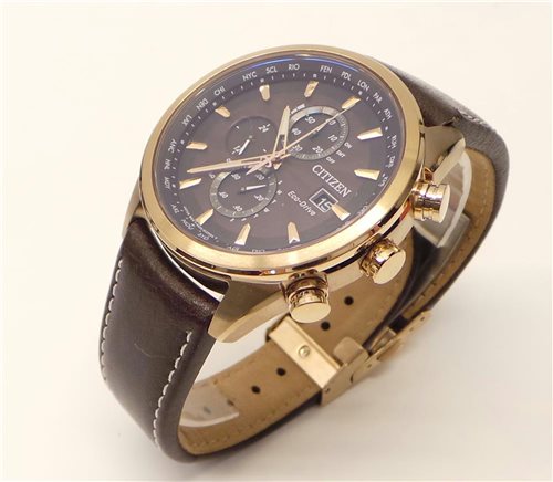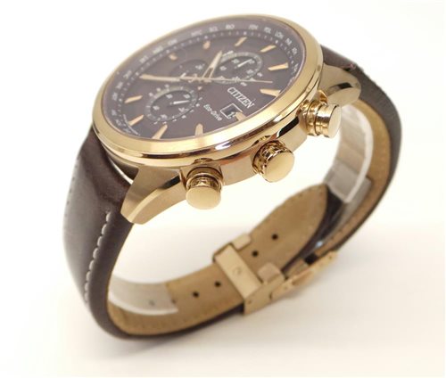 Cronografo. Cassa in acciaio rosé inossidabile spazzolato , corona, pulsanti e particolari cassa lucidi, Ø 43 mm. spessore 12 mm. ansa23 mm.. Movimento Eco-Drive a carica luce infinita,riserva dicarica di 10 mesi con indicatore livello di carica sul quadrante,funzione di radiocontrollo a 5 canali:ricezione segnale orario USA,Europa,Giappone,Cina, World time con orario di 26 città del mondo e ora UTC, cronografo a 1/5 di sec., calendario perpetuo,contatore 24 ore, giorno e data.Vetro zaffiro piano. Quadrante marrone "cioccolata"index rosé. Cinturino regolabile in pelle marrone testa di moro medio lucido,chiusura deployante in acciaio rosé. Impermeabile 200 metri. Peso 97,6 grammi.