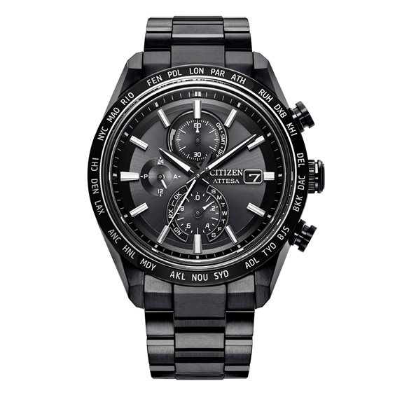 Cronografo Uomo Radiocontrollato Collezione Attesa modello Stratosphere Sapphire Bezel. Movimento Eco-Drive a carica luce con riserva di carica di 10 mesi e indicatore livello di carica sul quadrante. Caratteristiche Cassa e bracciale in Supertitanio con trattamento IP nero lunetta protetta da vetro zaffiro. Vetro zaffiro. WR 10 bar. Funzioni Radiocontrollato a 5 canali: ricezione segnale orario USA, Europa, Giappone, Cina. World time con orario di 26 città del mondo e ora UTC. Cronografo a 1/20 di sec. Calendario perpetuo. Bracciale regolabile chiusura deployante con pulsanti. Scatola Cofanetto Garanzia Ufficiale 5 Anni.