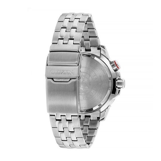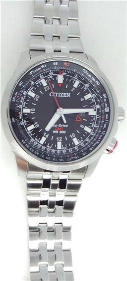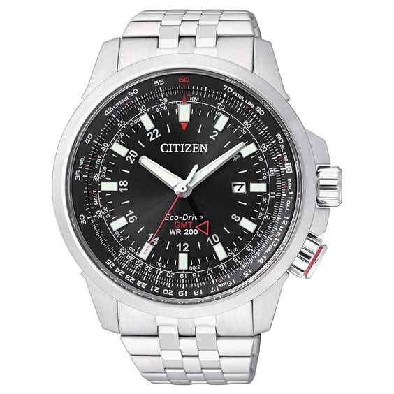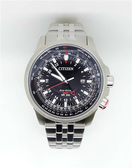 Movimento quarzo Eco-Drive (a carica luce infinita), riserva di carica di 240 giorni, GMT dual time, cassa in acciaio, diametro 45mm, bracciale in acciaio, vetro minerale duro, impermeabilità 200m