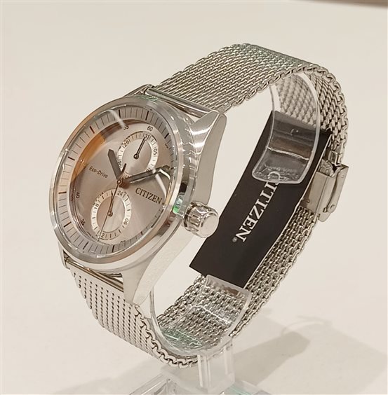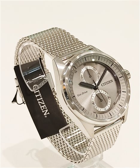 Orologio multifunzione. Cassa in acciaio lucido e spazzolato con fondo serrato a vite, ansa 22 mm. Movimento Eco-Drive a carica luce con riserva di carica 180 giorni. Vetro minerale. Quadrante colore acciaio, lancette nere e luminose, contatori giorno e data. Bracciale regolabile in acciaio, modello maglia milanese.