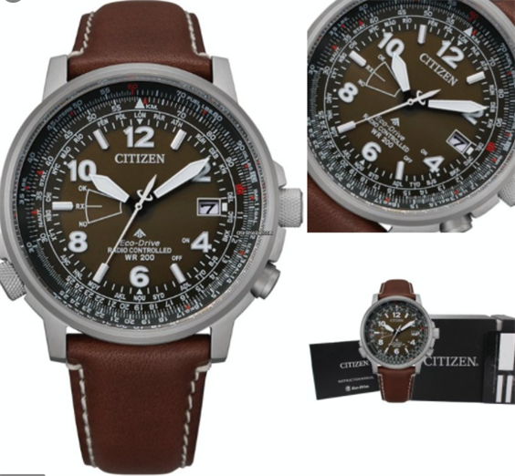 Orologio Solo Tempo Uomo Collezione PILOT RADIOCONTROLLATO. Cassa in acciaio spazzolato diametro 42,5mm. corona a vite, ansa cinturino 22mm. Movimento Eco-Drive a carica luce con riserva di carica di 2 anni. Radiocontrollato a 5 canali:ricezione segnale orario USA,Europa,Giappone,Cina. World time con orario di 26 città nel mondo. Calendario perpetuo.Quadrante verde con cifre e lancette luminose, ghiera interna girevole con sistema regolo calcolatore aereonautico.Vetro zaffiro. Cinturino regolabile marrone, chiusura déployante con pulsanti. Impermeabile 20 atm.(200 mt.). Scatola libretto istruzioni e garanzia 2 anni originali.