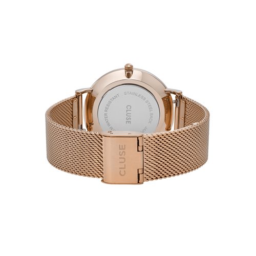 Orologio donna Cluse- collezione boho chic- con movimento al quarzo, solo tempo, cassa in acciaio rosato 38mm e quadrante nero, con cinturino in maglia milano rosato. Resistenza all'acqua 3atm.
