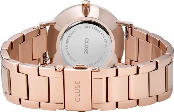 Orologio donna Cluse Minuit La nostra collezione Minuit è un inno alle notti stellate e ai look eleganti da sera. Il design delicato e leggero rende questo orologio l’accessorio perfetto per un look raffinato e di tendenza. Con classico quadrante bianco e cinturino lucido a tre maglie color oro rosa. Il cinturino è intercambiabile con qualsiasi altro cinturino della stessa misura.