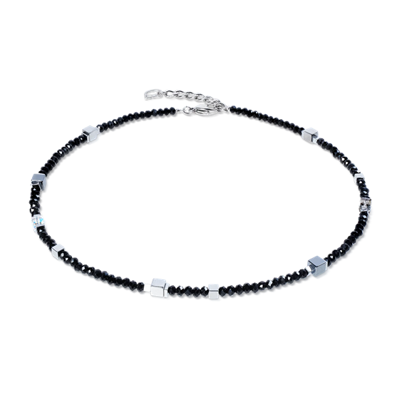 Joyful Colours Flex bracciale argento-nero MATERIALE: Cristalli Swarovski® Ematite Vetro molato Acciaio inox BLOCCO: Chiusura a moschettone acciaio inox Indossato a doppio giro sul polso, il bracciale costruisce un look strutturato con una tensione moderna ben definita. Come choker, con una lunghezza di circa 35–37,5 cm, il design appare puro, cool e molto versatile nello styling. Il nero si abbina con facilità a look minimali, outfit monocromatici, combinazioni business e styling serali dal carattere urbano.
