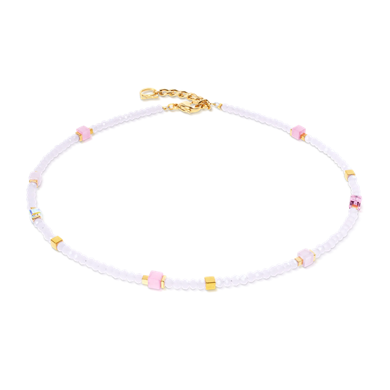 Joyful Colours Flex bracciale oro-rosa MATERIALE: Cristalli Swarovski® Ematite con finitura in ossido di titanio Occhio di tigre sintetico Vetro molato Acciaio inox oro BLOCCO: Chiusura a moschettone acciaio inox oro Indossato a doppio giro sul polso, il bracciale appare morbido, fluido e naturalmente presente. Come choker, con una lunghezza di circa 35–37,5 cm, costruisce un look essenziale dalla luminosità delicata. La palette rosa si abbina con facilità a crema, beige, bianco, grigio e pastelli soft, aggiungendo una nota femminile e contemporanea a look business, styling quotidiani e outfit serali. Un gioiello premium e una raffinata idea regalo dall’allure delicatamente moderna.