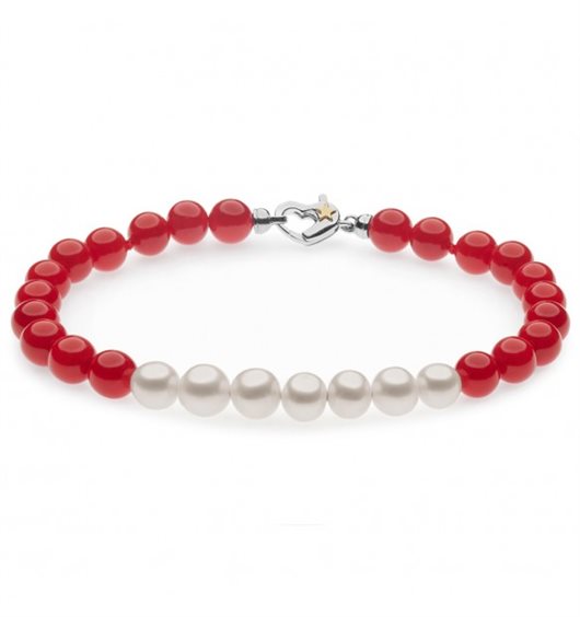 Filo di perle shell corallo dal diametro di 6 mm e cinque perle coltivate centrali dal diametro di 6/6,5 mm. Chiusura a moschettone in argento 925% con stella in oro 18kt. Ha lunghezza di 18 cm.