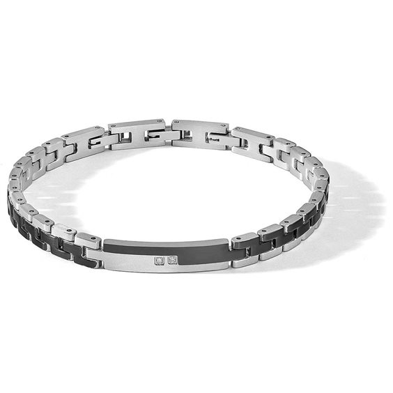 Bracciale da uomo di Comete della collezione Module. Bracciale in acciaio lucido e pvd nero. Diamanti bianchi P.Ct. 1. Lunghezza standard a 21 cm, riducibile grazie alla doppia chiusura a 19,5 cm.