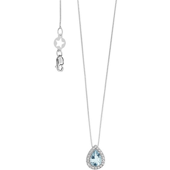 Girocollo Da Donna Di Comete Della Collezione Di Azzurra Prestige. Gioiello Realizzato In Oro Bianco 750 ‰. Diamanti P.Ct.8 Col. G Purezza Si, Aquamarina Prestige Taglio Goccia 7X5 Ct. 0,6. Larghezza Centrale 7,97 Mm. Lunghezza Centrale 10,10 Mm. Profondità Centrale 4,20 Mm. Catena Misura Standard 42. La Referenza È Glq 285