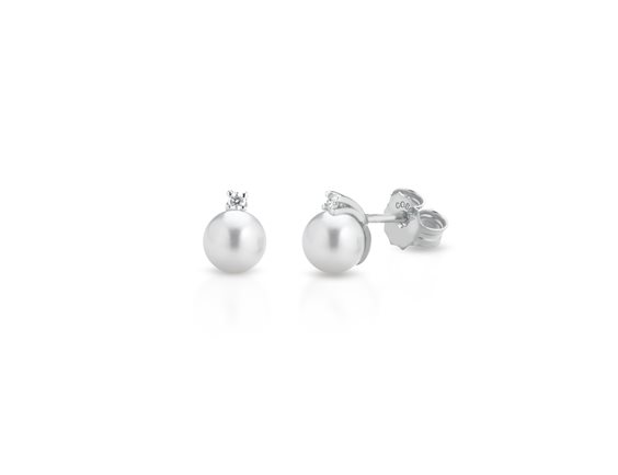 ORECCHINI CON PERLE E DIAMANTI GAMBO ORO BIANCO 18CT MISURA PERLA AKOYA 5.5/6mm.