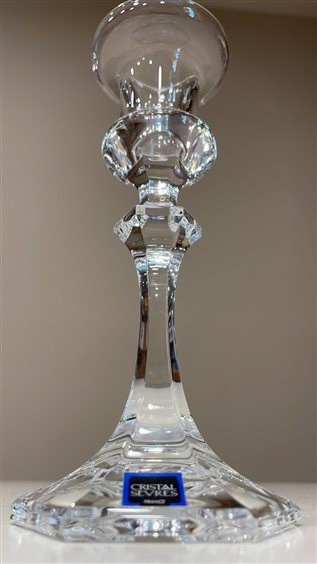 PORTACANDELE A 1 FIAMMA DI CRISTAL SEVRES IN CRISTALLO TRASPARENTE CON SIMMETRIA AL PIEDE. GIÀ NEL 1762 LA VETRERIA DI SEVRES FU CONSIDERATA UNA DELLE TRE MIGLIORI FORNACI DI FRANCIA. E’ IL MARCHESE DI MARIGNY CHE INTRODUCE IL CRISTALLO NELLA PRODUZIONE DI SEVRES E CONVERTE L’ EUROPA ALLA TRASPARENZA INEGUAGLIABILE DI UN MATERIALE CHE DIVENTA ORMAI NECESSARIO A TUTTE LE GRANDI TAVOLE. IN UN SECOLO E MEZZO CRISTAL DE SEVRES CONQUISTA GLI APPASSIONATI DELL’ ARTE E DELLA TAVOLA PARTICOLARMENTE INTRANSIGENTI SULLA QUALITÀ E NELL’ ESTETICA. OGGI CRISTAL SEVRES CONIUGA LA PERFEZIONE ARTIGIANALE DEL ‘FATTO A MANO E LA SENSIBILITÀ CREATIVA AL PUNTO CHE MOLTI DEI MAESTRI VETRAI CHE LAVORANO IN SEVRES HANNO RICEVUTO IL PRESTIGIOSO TITOLO DI ‘MEILLEUR OUVRIER DE FRANCE’.