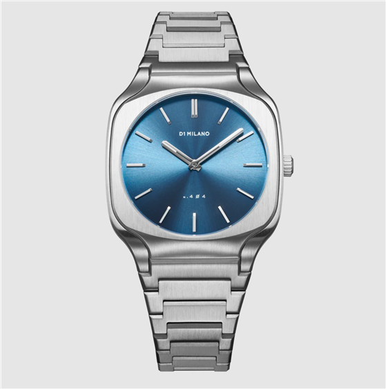 Orologio unisex D1 Milano SQBJ07 Caribbean Blue Collezione Square solo tempo, al quarzo con movimento Citizen Miyota 1L22. Cassa quadrata in acciaio inox satinato di diametro 37 mm e spessore 6,45 mm. Quadrante rotondo blu effetto soleil con indici applicati argentati. Ghiera in acciaio inox. Vetro zaffiro con trattamento anti-riflesso blu. Cinturino in acciaio inox satinato, con chiusura a doppio deployante. Spessore WR 5 Atm.