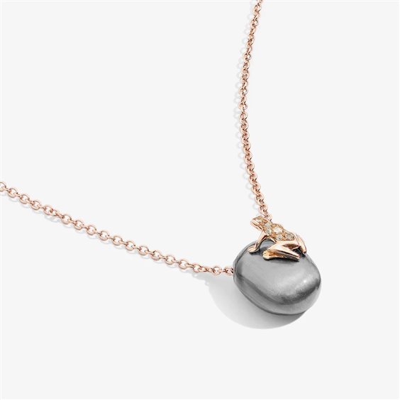 La rana è la protagonista assoluta dell'iconica collezione Happy Frog, creata nel 1994. Ispirandosi al mondo naturale, nasce un pendente che ha la forma di un sasso, sul quale poggia una rana in Oro e Pietre Preziose. Slancio creativo e artigianalità orafa italiana sono alla base della collezione in cui la ranocchia diventa un vivace ed ironico porta fortuna. La collana e la rana sono in Oro rosa 18k e Diamanti. Un moschettone di chiusura che può essere agganciato in più anellini consente di regolarne la lunghezza. La colorazione grigio perlato del sasso è ottenuta su base argento 925 tramite cataforesi. Eventuali imperfezioni nella colorazione attestano questa manualità. La colorazione resiste agli agenti atmosferici ma non ai graffi e alle botte.Materiale: Oro rosa 18k e Argento 925 Pietre preziose: Diamanti 0.10 ct Collezioni: Happy Frog Lunghezza totale: 42 cm regolabile fino a 38 cm