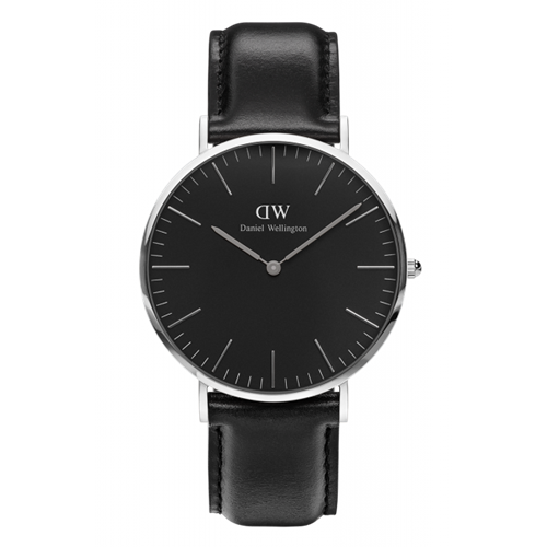 Orologio solo tempo con cassa in acciaio. Quadrante nero, cinturino in pelle nero. Movimento al quarzo, resistente all'acqua 3 atmosfere.
