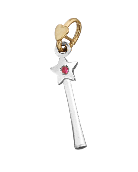 Ciondolo della collezione Vivi la magia! del magico mondo della natura Soggetto Bacchetta “Brilla!” Disponibile in argento 925°/°° con contromaglia cuoricino in oro 9 kt e in oro rosa o oro giallo con zaffiro rosa