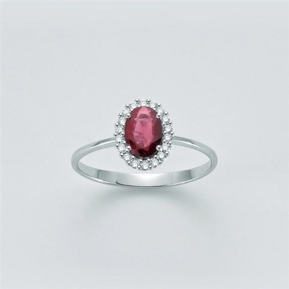 Anello in oro bianco, modello cestino con rubini e contorno di diamanti 0,06 ct.
