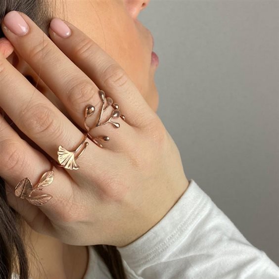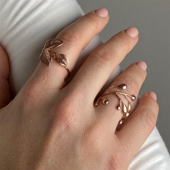 ELECICALE GIOIELLI Anello ULIVO, collezione Emily Dickinson. Sapiente riproduzione artigianale delle foglie d'ulivo in argento 915 in bagno d'oro giallo 18kt. Anello aperto, misura centrale 14 regolabile di due misure ca. in più o in meno.