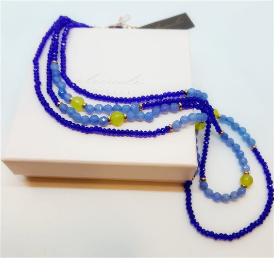 ELECICALE GIOIELLI Collana a due fili in quarzo blu avio e arancione con chiusura, prolunga 2 cm e elementi in argento 925 in bango oro rosa 24 kt. Lavorazione artigianale, design originale, made in Marche. Chiusura con moschettone.Gioiello anallergico, nichel free.