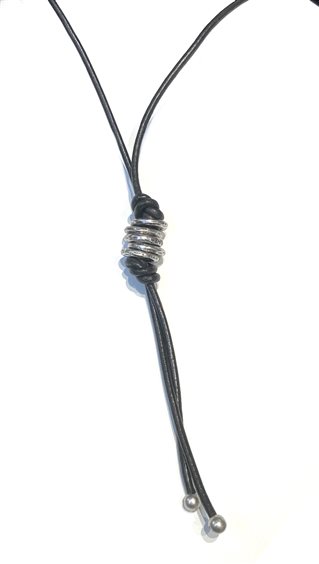 Collana in cuoio nero con ciondolo ad anelli in argento anticato.