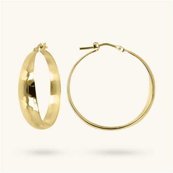 Orecchini pendenti a cerchio Etrusca Gioielli realizzati in lega Golden, placcata oro giallo 18kt, dalla superficie martellata; chiusura a baionetta. Diametro esterno 3.1 cm. Designed and made in Italy Ipoallergenici Lunghezza (cm): 3.1 Peso (g): 4.5