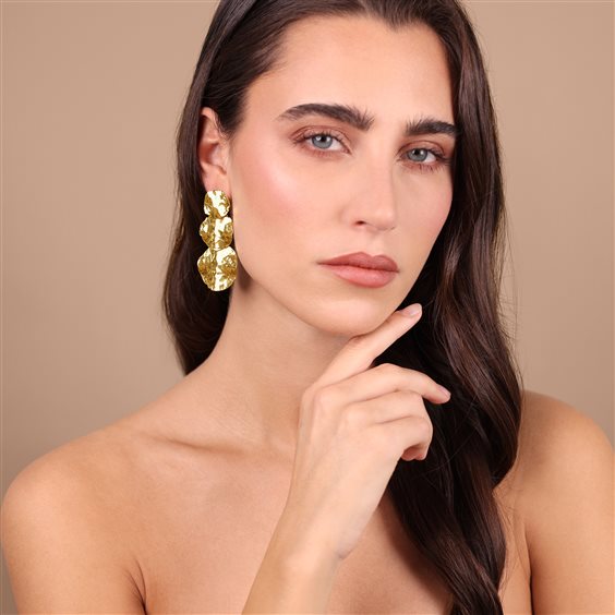 Orecchini pendenti Etrusca Gioielli realizzati in lega Golden, placcata Oro giallo 18kt o Rodio, con tre dischi graduati (18-24-30 mm) e superficie martellata. Lunghezza 6 cm. Chiusura a perno e farfalla. Made in Italy Ipoallergenici & Nickel Free Peso (g): 13.2