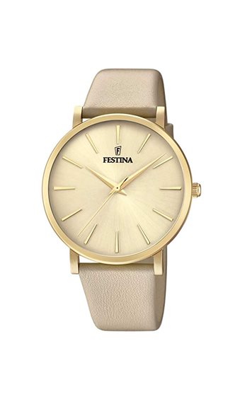 Orologio Festina da donna con movimento al quarzo Miyota 2035 e funzioni di solo tempo. Cassa rotonda in acciaio inox placcato oro giallo dal diametro di 38 mm con quadrante analogico champagne, tre lancette, indici a bastoni e logo festina nella parte alta. E' protetto da un vetro minerale. Il cinturino in pelle beige ha una pratica chiusura con fibbia ardiglione. Resistente all'acqua fino a 30 metri di profondità. Appartiene alla collezione Boyfriend. L'articolo viene spedito completo di confezione originale e garanzia.