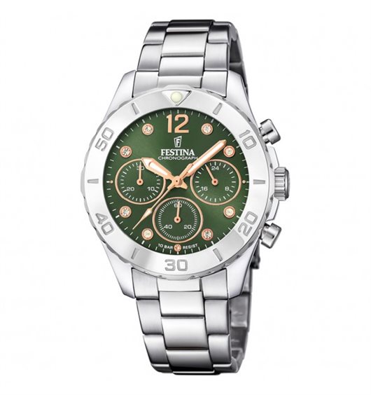 Orologio da donna con movimento al quarzo Miyota JS20-H1 e funzioni di cronografo. Cassa in acciaio inox dal diametro di 39 mm e spessore di 11,3 mm. Quadrante verde con cristalli bianchi agli indici e numero arabo a ore 12. Cinturino a maglie in acciaio anallergico largo 18,8 mm; chiusura deployante con pulsanti. Resistente all'acqua fino a 100 metri di profondità.