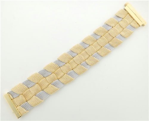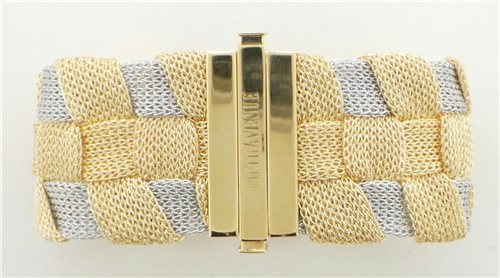 Bracciale donna in argento e lurex , maglia intrecciata dorata e bianca , chiusura dorata con bottoni laterali , lunghezza cm 18. Immagine indicativa , la confezione può variare in forma e colore.