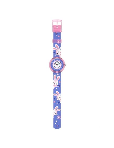 Orologio Flik Flak per Bambini - collezione "Friends Fur-Ever" - modello "Peek-a-Bunny", con cinturino viola imbellito da coniglietti stampati. Orologio solo tempo al quarzo con cassa rosa da 32mm e quadrante viola.