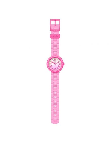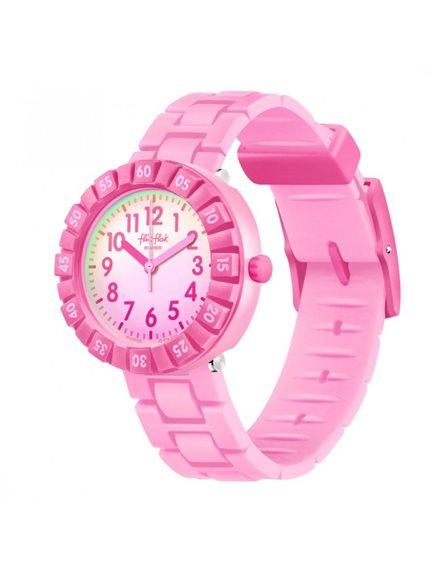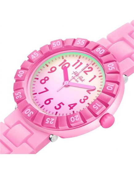 Orologio Flik Flak per Bambini - collezione "Summer Splash" - modello "Pink Splash", con cassa rosa da 37mm e quadrante con effetto solar spectrum. Orologio solo tempo al quarzo con cinturino in silicone rosa.