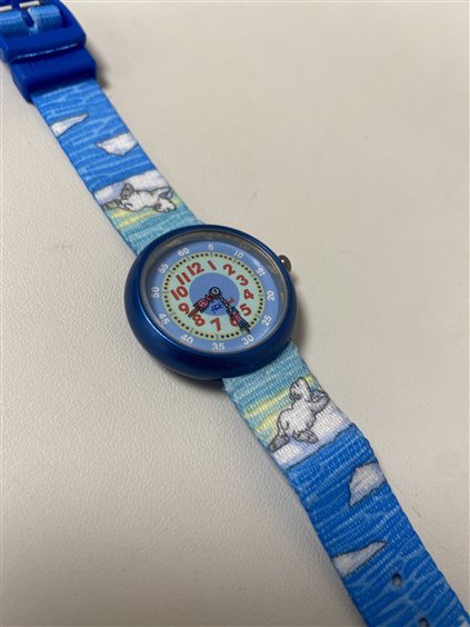 Orologio Flik-Flak - The Little Polar Bear. L'orologio viene accompagnato da un simpatico puzzle "The Little Polar Bear" e da un orologio montabile in carta per insegnare a leggere l'orario ai bambini