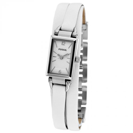 Orologio da donna Fossil. Cassa in acciaio inossidabile di dimensioni 21 x 11 mm. Quadrante bianco, funzione solo tempo. Cinturino in pelle bianco con chiusura in acciaio a gioiello.