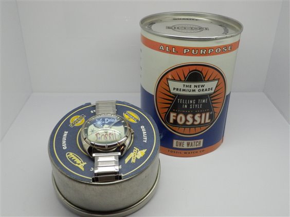 Orologio da collezione in acciaio con bracciale estensibile. Vetro a cupola con effetto simile a lente. La scatola in metallo tipo lattina, presenta piccole ammaccature come evidenziato nelle foto.