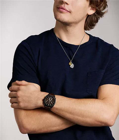 Ispirato alla classica industria meccanica americana, il cronografo Machine attira l’attenzione con la sua grintosa ghiera zigrinata. Inconfondibilmente maschile, con una vistosa cassa da 44 mm che racchiude un quadrante nero spazzolato con dettagli testurizzati, il tutto protetto da un quadrante in vetro minerale color ambra. Alimentato da un movimento a cronografo al quarzo di precisione, questo robusto orologio è realizzato per durare nel tempo con un cinturino in pregiata pelle marrone. Un vero e proprio esempio di stile di ispirazione industriale. I prodotti in pelle di Fossil sostengono la produzione responsabile con il supporto del Leather Working Group.