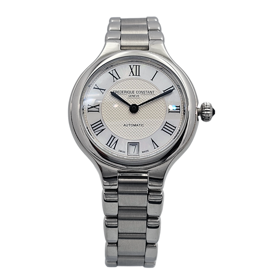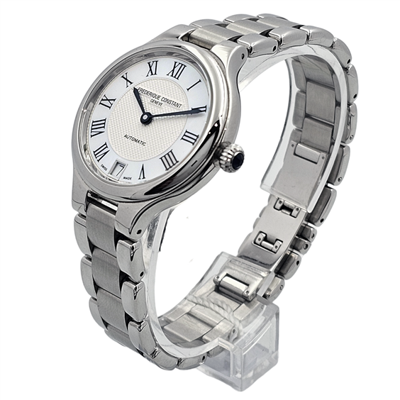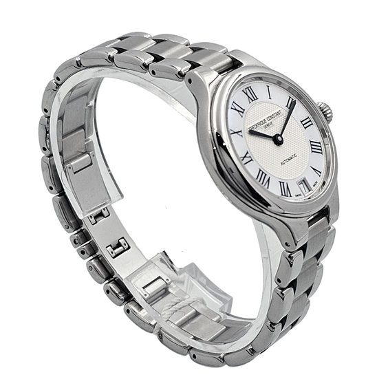 Frederique Constant Classics Delight FC-306MC3ER6B è un segnatempo femminile che incarna eleganza e raffinatezza in una dimensione compatta e perfettamente proporzionata. La cassa da 33 mm in acciaio si adatta con naturalezza al polso, offrendo una presenza discreta ma estremamente sofisticata. Il quadrante in madreperla argento dona profondità e luminosità, creando riflessi delicati che cambiano a seconda della luce. I numeri romani completano l’estetica classica, conferendo al modello un carattere senza tempo, mentre la finestrella della data si integra armoniosamente nel design. Il movimento automatico FC-306 garantisce precisione e affidabilità, unendo la tradizione dell’orologeria svizzera a una praticità quotidiana. Il bracciale in acciaio completa il segnatempo con eleganza e continuità stilistica, rendendolo ideale sia per occasioni formali che per un utilizzo quotidiano raffinato.