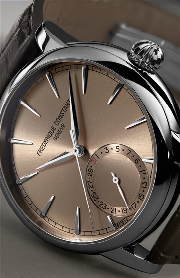 Anche se il nome continua a essere “Classic”, si tratta di un classico rivisitato: il Classic Date Manufacture si dota di un nuovo calibro di manifattura FC-706, che offre ora 72 ore di riserva di carica, per una garanzia portata a cinque anni. La cassa in acciaio si riduce di 2 mm per un totale di 40 mm, un diametro classico e di classe che sfoggia un nuovo quadrante sprovvisto di numeri, con indici assottigliati e una minuteria “chemin de fer”. Questo nuovo modello riflette un approccio totalmente snello. In primo luogo, il diametro della cassa è stato notevolmente ridotto, passando da 42 mm a 40 mm. Un’apertura in linea con le aspettative degli intenditori di alta orologeria, che rispecchia anche le dimensioni della maggior parte dei segnatempo senza tempo degli ultimi 50 anni. Nonostante questa sottile riduzione, il quadrante sembra più essenziale e libero che mai. La finitura soleil permette di diffondere la luce con costanza e delicatezza. Le lancette centrali, altrettanto sfaccettate al diamante (ore e minuti soltanto) e lucidate a mano, sono ormai di tipo Alpha, per armonizzarsi con il profilo degli indici. La totale assenza di numeri, romani o arabi che siano, propone una lettura aperta di ore e minuti. La precisione è garantita da una nuova minuteria di tipo “chemin de fer”. . A ore 3, ritroviamo una corona “a cipolla”.