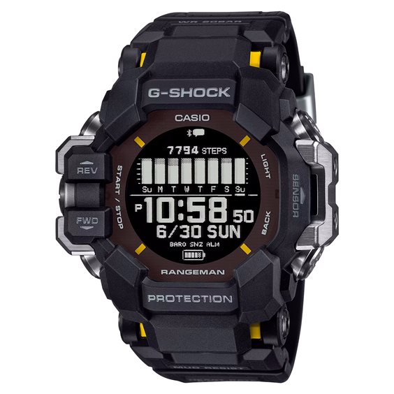 Il RANGEMAN GPR-H1000 è dotato di un nuovissimo livello di robustezza e ulteriori funzionalità, come il cardiofrequenzimetro integrato, il sistema GPS e il display LCD ad alto contrasto e di facile lettura con tecnologia Memory-in-Pixel (MIP). Per tenere traccia dei tuoi spostamenti in tempo reale, sei sensori rilevano accuratamente i movimenti del corpo e i cambiamenti nell'ambiente: cardiofrequenzimetro per misurare i cambiamenti nel flusso sanguigno e monitorare la frequenza cardiaca; accelerometro per misurare l'attività come il numero di passi effettuati; giroscopio per tiene traccia delle bracciate e delle virate in piscina; e sensore magnetico, di pressione e termico. L’orologio è equipaggiato con sistemi per il rilevamento dei dati per le attività sportive (trekking, corsa, camminata, ciclismo, nuoto, allenamenti in palestra), offrendo prestazioni anche nelle condizioni più difficili e resistendo agli urti, alla polvere, al fango e all'acqua. La struttura interna dell’orologio è protetta da grandi componenti metallici sui lati, che proteggono l'antenna GPS e i sei sensori interni. I pulsanti sono protetti da parti cilindriche in acciaio inossidabile e da guarnizioni per evitare la contaminazione con fango e polvere. L'orologio include anche la funzionalità GPS integrata per misurare posizione, distanza e velocità di movimento. Tieni traccia dei tuoi spostamenti in tempo reale mentre sei in movimento. Il cinturino è realizzato in morbido uretano per garantire una vestibilità estremamente confortevole al polso. La superficie del cinturino, inoltre, presenta una texture antiscivolo. I principali componenti in resina della lunetta, della cassa e del cinturino sono realizzati con resina bio-based. Abbiamo dato il massimo per prepararti a sfidare i limiti della resistenza.