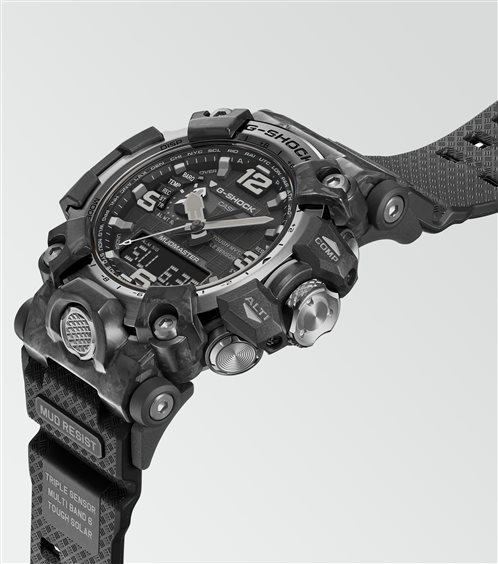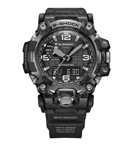 Orologio Casio G-Shock Mudmaster GWG-2000 evoluzione del classico GWG-1000 realizzato con una nuova cassa più sottile (16,1mm) e leggera (solo 106 grammi), diametro ridotto a 54,4mm. La lunetta è realizzata in fibra di carbonio forgiato, un materiale composito utilizzato per esempio nelle fusoliere degli aerei. La resina rinforzata con fibra di carbonio viene forgiata in una pressa ad alta temperatura, lavorando così parti resistenti ma leggere con forme complesse. La cassa in resina rinforzata con fibra di carbonio protegge il modulo, offrendo allo stesso tempo resistenza, leggerezza ed eccellente durata. Queste proprietà della fibra di carbonio hanno permesso di ridurre le dimensioni della cassa, che è più sottile di 1,9 mm rispetto al modello precedente (GWG-1000). La nuova combinazione di pulsanti con tubi in acciaio inox e aggiuntivo materiale interno in silicone danno vita ad un orologio che non soltanto assorbe gli urti, ma è completamente sigillato. Il vetro in zaffiro protegge il quadrante digitale e analogico sottostante. Il movimento è alimentato ad energia solare e dotato di indicatore del livello di carica. L’antenna radicontrollata multibanda consente la sincronizzazione dell’orario in Europa, America, Cina e Giappone. L’ultima generazione di sensori per altimetro, barometro e bussola forniscono i dati necessari per accompagnare qualsiasi avventura terrestre.