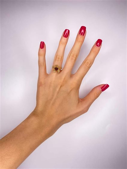 Anello appartenente alla collezione Biancospino! L'anello è interamente fatto a amano e ciò lo si può riscontare anche da varie finiture al grezzo, che vogliono evidenziare l'unicità di questo prodotto. Il gioiello è regolabile e si compone di un fiore di biancospino: la parte centrale è composta da uno zircone rosso, mentre i petali sono dati da una rete d'argento. L'intero prodotto è stato sottoposto ad una doratura. La decorazione ha un diametro complessivo di 1.70 cm. Il prodotto è disponibile dalla misura 8 alla misura 25; nell’eventualità si desiderasse realizzare una misura non disponibile, contattaci, cercheremo di venire incontro alle tue esigenze. E' inoltre personalizzabile, su richiesta il colore della pietra centrale.