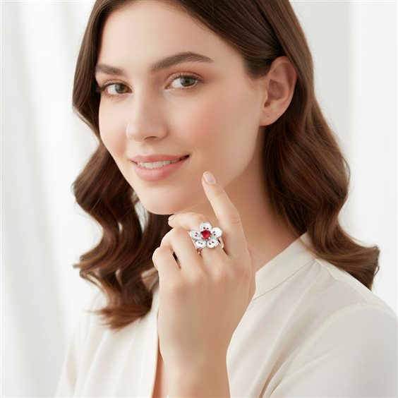 Anello appartenente alla collezione Biancospino! L'anello è interamente fatto a mano e ciò lo si può riscontare anche da varie finiture al grezzo, che vogliono evidenziare l'unicità di questo prodotto. Il gioiello è regolabile e si compone di un fiore di biancospino; la parte centrale è composta da uno zircone rosso, mentre i petali sono smaltati a fuoco con pistilli rosso. La decorazione ha un diametro complessivo di 1.70 cm. Il prodotto è disponibile dalla misura 8 alla misura 25; nell’eventualità si desiderasse realizzare una misura non disponibile, contattaci, cercheremo di venire incontro alle tue esigenze. E inoltre personalizzabile, su richiesta il colore della pietra centrale.